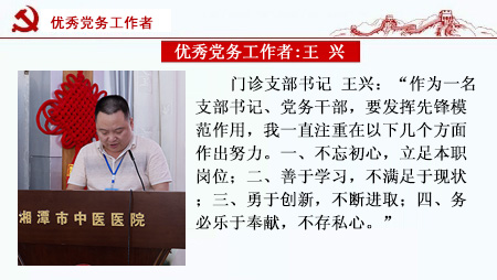 會(huì)上,院黨委委員、紀(jì)委書記萬嵐宣讀了表彰決定;獲得優(yōu)秀黨務(wù)工作者榮譽(yù)的門診支部書記王興,新入黨代表王泳錕先后做了典型發(fā)言和表態(tài)發(fā)言;會(huì)議還對(duì)先進(jìn)黨支部、優(yōu)秀黨務(wù)工作者和優(yōu)秀共產(chǎn)黨員進(jìn)行了表彰。