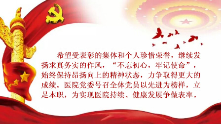 院黨委書記賀山虎代表院黨委,向受表彰的先進(jìn)黨支部、優(yōu)秀黨務(wù)工作者和優(yōu)秀共產(chǎn)黨員表示熱烈的祝賀!向全院共產(chǎn)黨員和廣大職工致以誠(chéng)摯的問候!他在總結(jié)醫(yī)院半年的黨建工作的同時(shí),也對(duì)全院各級(jí)黨組織和廣大黨員干部提出了更高的要求。他說:黨的十九大以來,習(xí)近平總書記多次強(qiáng)調(diào),實(shí)現(xiàn)中華民族偉大復(fù)興的“中國(guó)夢(mèng)”,必須把我們黨建設(shè)好。今后我院抓好黨建工作,