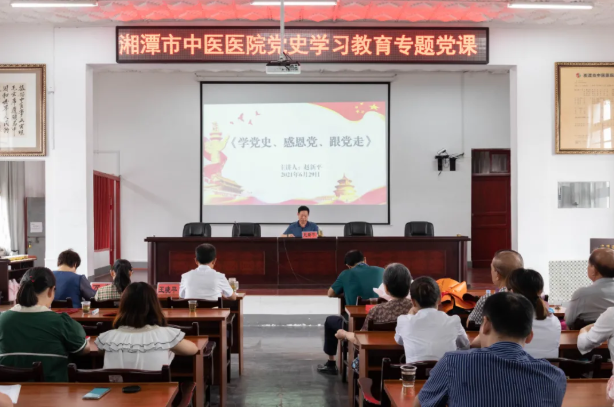 為深入推進黨史學習教育,從黨史中汲取力量,在實踐中砥礪前行。6月29日下午,市衛(wèi)健委黨史學習教育第八巡回指導組組長趙新平應(yīng)邀在湘潭市中醫(yī)醫(yī)院講授題為《學黨史,感恩黨,跟黨走》的黨史學習教育專題黨課。醫(yī)院黨委領(lǐng)導班子成員、全體黨員、離退休支部黨員代表近120人現(xiàn)場聆聽了專題黨課。醫(yī)院黨委書記賀山虎主持。