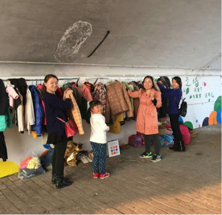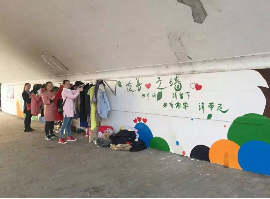 走過街頭的愛心墻,請您停一停!走過湘潭一大橋,你會發(fā)現(xiàn)橋底的一面墻面被涂鴉成了彩色,墻上掛了一排衣物,下面還有鞋子,墻上有一行標語:“友善之墻,如有閑,請留下;如有需要,請帶走。”