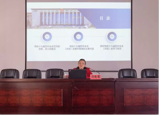 劉曉霞緊扣習(xí)近平總書記在黨的十九屆四中全會(huì)上的重要講話精神和全會(huì)通過(guò)的《決定》,從全會(huì)召開的背景、意義和看點(diǎn),黨的十九屆四中全會(huì)《決定》的基本框架和主要內(nèi)容,抓好《決定》的學(xué)習(xí)貫徹等3個(gè)方面進(jìn)行了全面、翔實(shí)的解讀,內(nèi)容生動(dòng),深入淺,贏得陣陣掌聲。