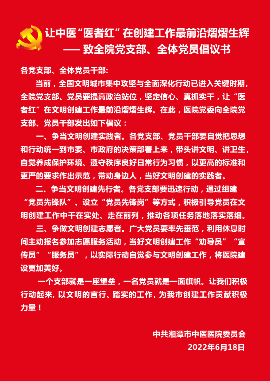 文明城市是一座城市最美的名片。在全國(guó)文明城市集中攻堅(jiān)與全面深化行動(dòng)關(guān)鍵時(shí)期,湘潭市中醫(yī)醫(yī)院貫徹落實(shí)市委、市政府、市衛(wèi)健委關(guān)于深化全國(guó)文明城市創(chuàng)建工作要求,發(fā)出《讓中醫(yī)“醫(yī)者紅”在創(chuàng)建工作最前沿熠熠生輝》的倡議書,要求醫(yī)院各黨支部、黨員干部緊緊圍繞創(chuàng)文工作實(shí)際,充分發(fā)揮“兩個(gè)作用”,消除創(chuàng)文工作“空白點(diǎn)”,讓黨旗在創(chuàng)文路上高高飄揚(yáng)。