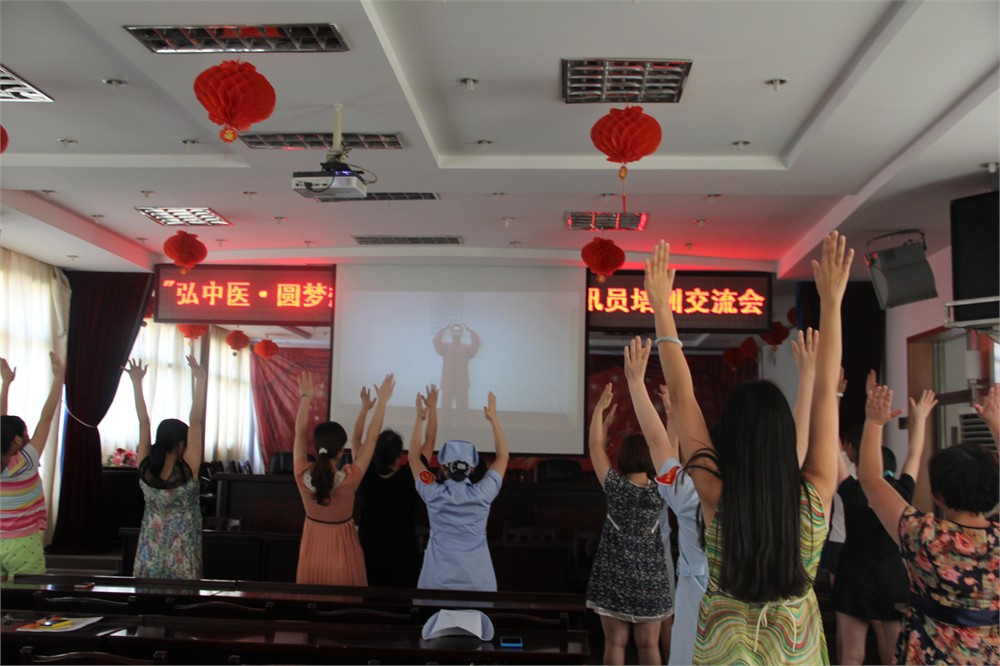 八段錦”是國(guó)家體育總局健身氣功管理中心組織編創(chuàng)的健身氣功新功法之一,旨在為大家緩解壓力、解除疲勞、促進(jìn)身心健康。八段錦:意為動(dòng)作舒展優(yōu)美,如錦緞般優(yōu)美、柔順,又因?yàn)楣Ψü矠榘硕?,每段一個(gè)動(dòng)作,故名為“八段錦”。此項(xiàng)運(yùn)動(dòng)動(dòng)作簡(jiǎn)單、易學(xué)、經(jīng)濟(jì)、可操作性強(qiáng),是一項(xiàng)很好的有氧運(yùn)動(dòng),柔筋健骨、養(yǎng)氣壯力,具有行氣活血、協(xié)調(diào)五臟六腑之功能。通過(guò)八段錦鍛煉可改善不良心理狀態(tài),疏通經(jīng)絡(luò)氣血,具有保精、養(yǎng)氣和存神的作用。以下附我院培訓(xùn)現(xiàn)場(chǎng)圖片。