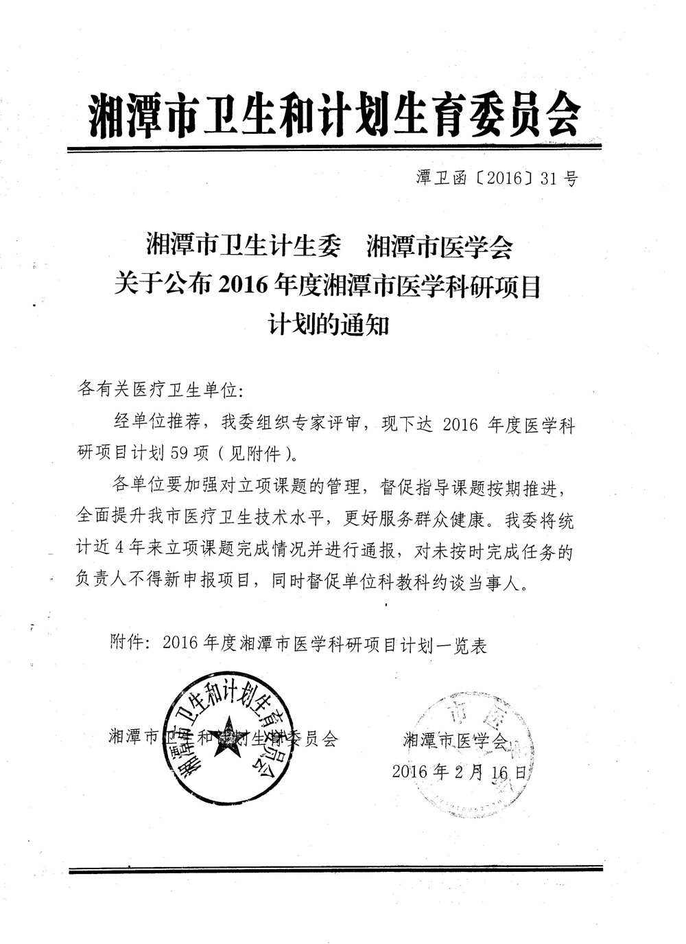 在以謝院長為核心的院領(lǐng)導(dǎo)班子的正確領(lǐng)導(dǎo)下,在“科教興院”方針引導(dǎo)下,我院各科室、部門申報科研項目的積極性明顯提高。2016年2月,經(jīng)各市直單位及縣市區(qū)衛(wèi)生局推薦,市衛(wèi)計委組織專家評審,我市共產(chǎn)生2016年度醫(yī)學(xué)科研項目計劃59項,其中我院共有九個項目入選,使我院在研的各級科技、衛(wèi)生主管部門立項的在研科研項目達到了21項(不含院級項目),濃厚了全院的科研氛圍、參與科研的人員明顯增多。課題名稱及項目負責(zé)人見下表,希望各課題組按照項目計劃書要求,克服困難、積極推進科研工作、按時結(jié)題。