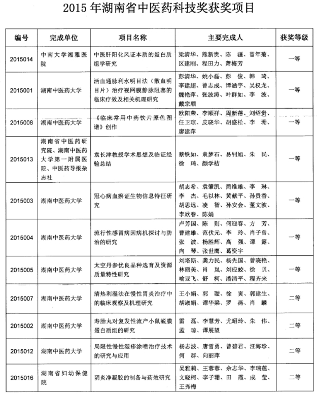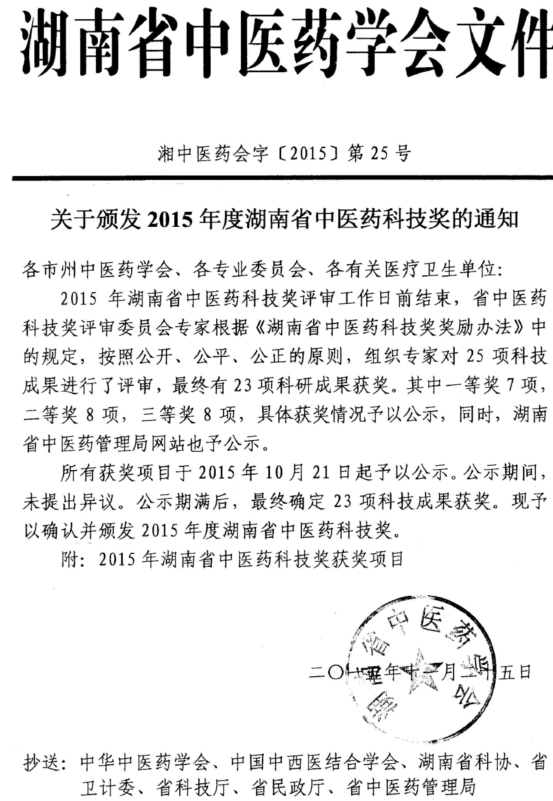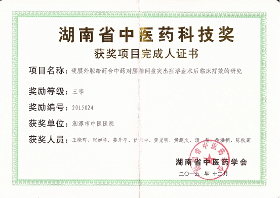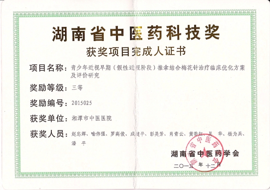 由我院業(yè)務(wù)副院長、針灸科學(xué)科帶頭人趙忠輝副主任醫(yī)師主持的科研項(xiàng)目《推拿結(jié)合梅花針治療青少年近視早期臨床優(yōu)化方案及療效評(píng)價(jià)研究》,該項(xiàng)目為市醫(yī)學(xué)會(huì)資助項(xiàng)目,于2013年通過成果鑒定并獲得當(dāng)年的湘潭市醫(yī)學(xué)科技一等獎(jiǎng),經(jīng)過近兩年的推廣優(yōu)化后,申報(bào)今年的省中醫(yī)藥科技獎(jiǎng);無獨(dú)有偶、雙喜臨門的是,我院脊柱骨科主任王曉暉主任醫(yī)師主持的《硬膜外腔給藥合中藥對(duì)腰椎間盤突出癥溶盤術(shù)后臨床療效的研究》也獲得今年的省中醫(yī)藥科技三等獎(jiǎng)!該項(xiàng)目是2011年湖南省中醫(yī)藥科研基金資助項(xiàng)目,經(jīng)過3年多時(shí)間的研究,于今年元月份經(jīng)湖南省中醫(yī)藥管理局、湖南省中醫(yī)藥學(xué)會(huì)組織成果鑒定,認(rèn)為該項(xiàng)目達(dá)到了省內(nèi)先進(jìn)水平。上述兩項(xiàng)目都是經(jīng)湘潭市中醫(yī)藥管理局推薦后,申報(bào)湖南省2015年中醫(yī)藥科技獎(jiǎng),經(jīng)過初評(píng)、小組評(píng)審、終評(píng)及公示等程序,上述兩各項(xiàng)目均榮獲湖南省中醫(yī)藥科技三等獎(jiǎng)。