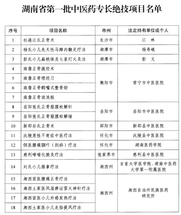 根據(jù)《國務(wù)院關(guān)于扶持和促進(jìn)中醫(yī)藥事業(yè)發(fā)展的若干意見》(國發(fā)〔2009〕22號(hào))“挖掘整理民間醫(yī)藥知識(shí)和技術(shù),加以總結(jié)和利用”的要求和省人民政府副省長李友志關(guān)于“加快中醫(yī)藥專長絕技收集整理”的指示精神,為推動(dòng)中醫(yī)藥的繼承創(chuàng)新,規(guī)范民間醫(yī)藥技術(shù)和方法的使用,我省自2013年以來在全省范圍內(nèi)組織開展了中醫(yī)藥專長絕技收集整理工作。經(jīng)各市州、各單位申報(bào)和推薦,省衛(wèi)生計(jì)生委和省中醫(yī)藥管理局組織省級(jí)相關(guān)專家初審、現(xiàn)場(chǎng)考核,對(duì)入圍的項(xiàng)目進(jìn)行初評(píng)和復(fù)評(píng)等程序,我院楊壽峨主任醫(yī)師為學(xué)術(shù)帶頭人的項(xiàng)目“楊氏小兒先天性馬蹄內(nèi)翻足療法”被評(píng)為湖南省首屆首屆中醫(yī)藥專長絕技項(xiàng)目。