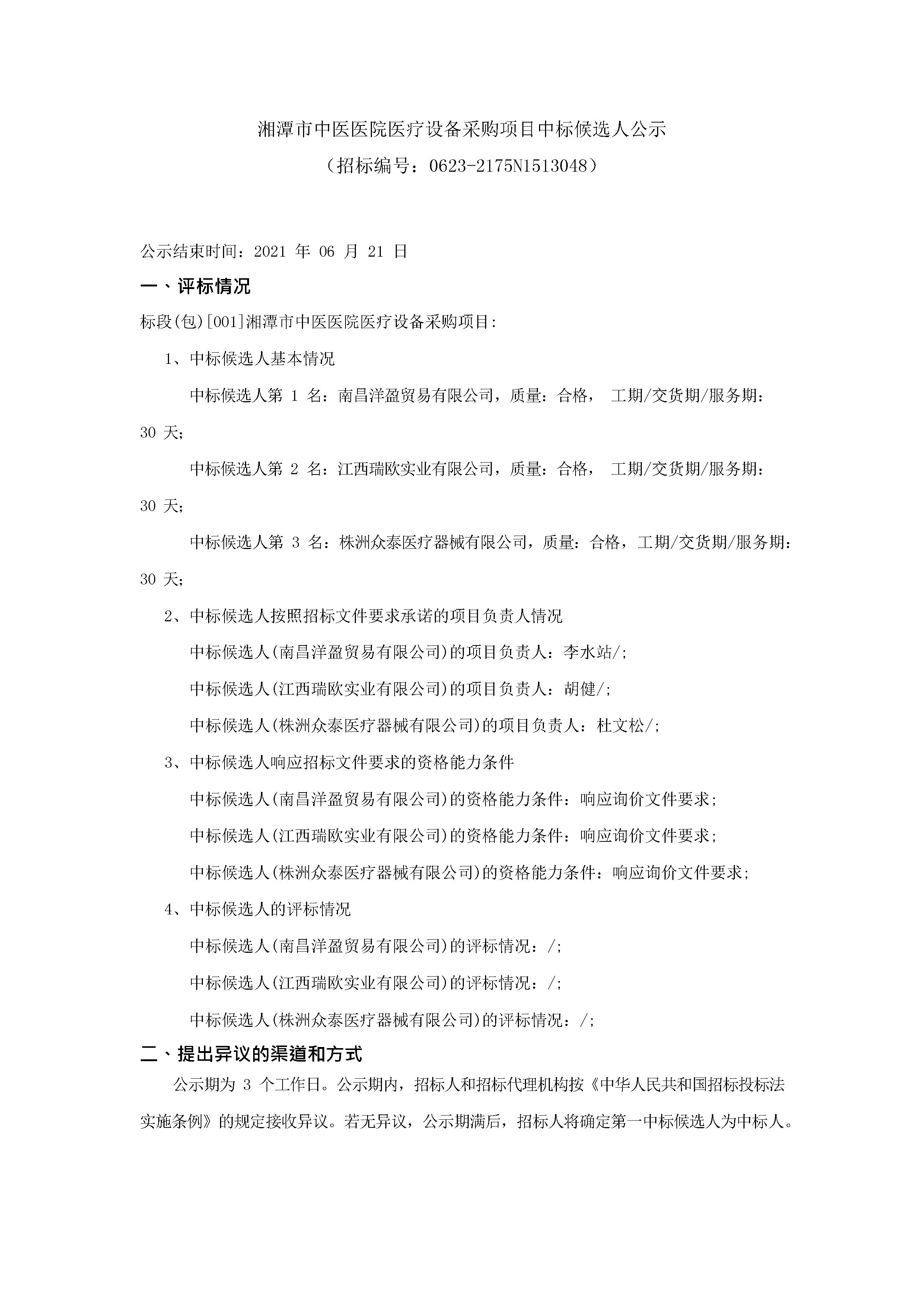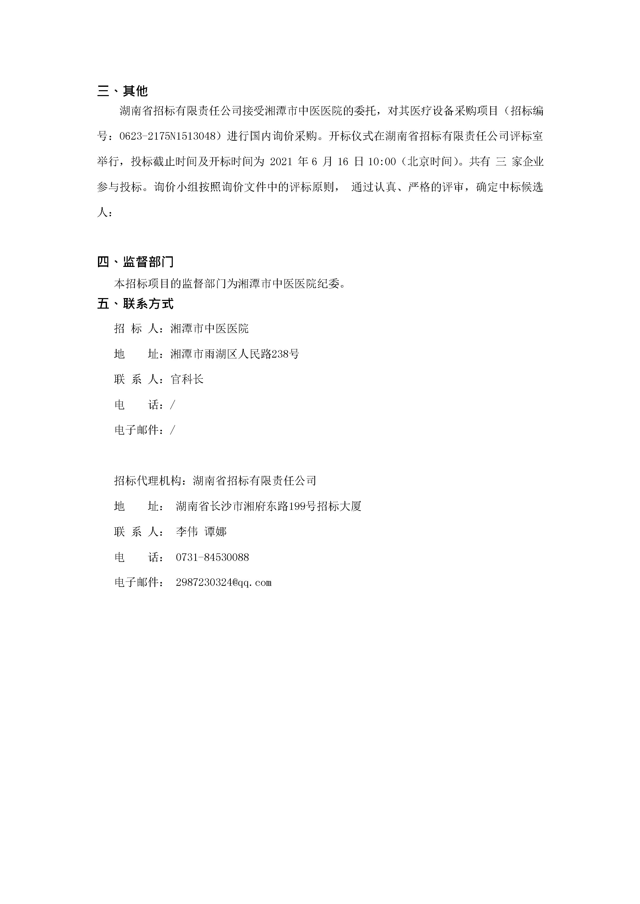 湘潭市中醫(yī)醫(yī)院醫(yī)療設備采購項目中標候選人公示 (招標編號:0623-2175N1513048)