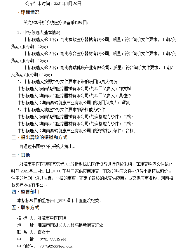 湘潭市中醫(yī)醫(yī)院熒光PCR分析系統(tǒng)醫(yī)療設備采購項目中標候選人公示