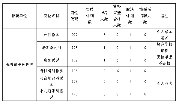 2018年湘潭市直公立醫(yī)院公開招聘專業(yè)技術(shù)人員資格審查工作已經(jīng)結(jié)束,根據(jù)《2018年湘潭市直公立醫(yī)院公開招聘專業(yè)技術(shù)人員公告》規(guī)定和審查結(jié)果,對審查合格人數(shù)未達(dá)到開考比例的崗位,取消或核減招聘崗位計(jì)劃。現(xiàn)將取消招聘崗位計(jì)劃公告如下: