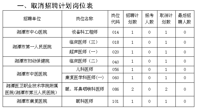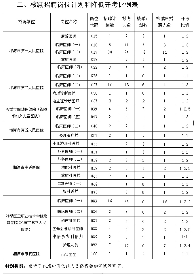 2019年湘潭市醫(yī)療衛(wèi)生事業(yè)單位公開招聘專業(yè)技術(shù)人員報(bào)名已經(jīng)結(jié)束,根據(jù)《2019年湘潭市醫(yī)療衛(wèi)生事業(yè)單位(含衛(wèi)健系統(tǒng)、民政系統(tǒng)、昭山示范區(qū)、湘潭醫(yī)衛(wèi)職業(yè)技術(shù)學(xué)院附屬醫(yī)院公開招聘專業(yè)技術(shù)人員公告》規(guī)定,筆試最低開考比例一般為1∶3。對少數(shù)的特殊專業(yè)或確實(shí)難以形成競爭的崗位,經(jīng)招聘單位申請,報(bào)主管部門、人社部門同意,可根據(jù)實(shí)際取消、核減相應(yīng)崗位招聘計(jì)劃或降低開考比例。在本次公開招聘報(bào)名中,部分崗位報(bào)名人數(shù)未達(dá)到1:3的筆試開考比例,但由于各單位專業(yè)技術(shù)人員都嚴(yán)重短缺,急需招聘這部分人員,因此對報(bào)名人數(shù)較少的特殊專業(yè)崗位或確實(shí)難以形成競爭的崗位,采取核減招聘計(jì)劃數(shù)或適當(dāng)降低開考比例的方式開考?,F(xiàn)將取消或核減招聘崗位計(jì)劃和降低筆試開考比例公告如下。