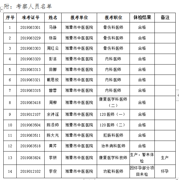 日前,2019年湘潭市中醫(yī)醫(yī)院公開招聘專業(yè)技術(shù)人員體檢工作已經(jīng)完成,現(xiàn)將體檢后取消部分招聘崗位計劃及考察事項公告如下: