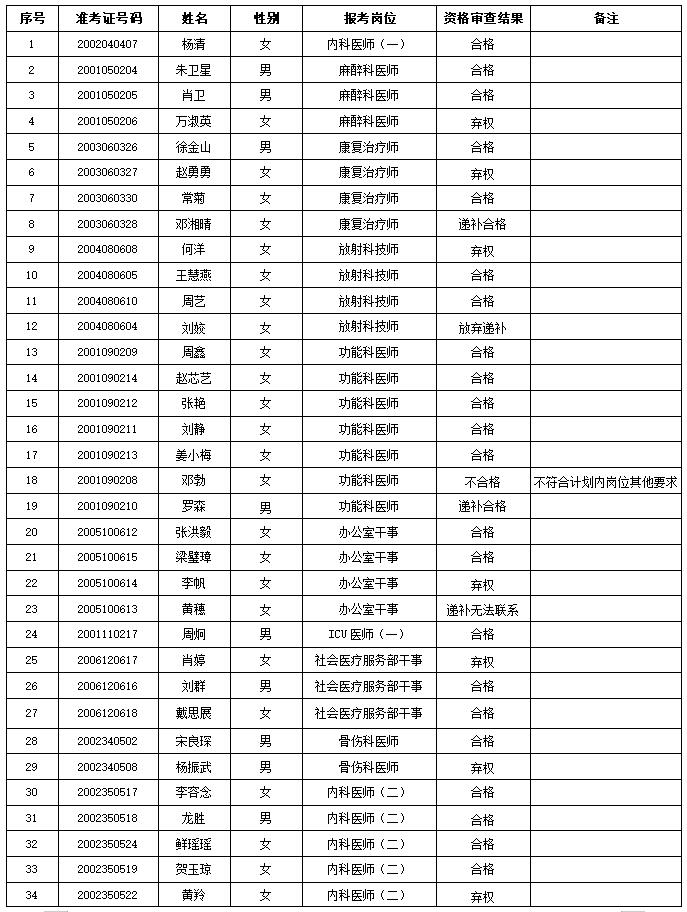 根據(jù)《2020年湘潭市婦幼保健院(湘潭市婦女兒童醫(yī)院)、湘潭市中醫(yī)醫(yī)院、湘潭市第五人民醫(yī)院(湘潭市精神衛(wèi)生中心)、湘潭市口腔醫(yī)院公開招聘專業(yè)技術(shù)人員公告》現(xiàn)就報考湘潭市中醫(yī)醫(yī)院考生面試前資格審查結(jié)果公告如下: