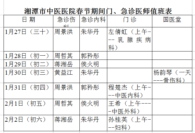 湘潭市中醫(yī)醫(yī)院春節(jié)期間門、急診醫(yī)師值班表