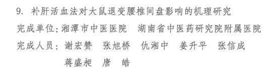 本次研究由我院院長謝宏贊主任醫(yī)師親自牽頭,國家級名中醫(yī)、湖南省中醫(yī)藥研究院附屬醫(yī)院仇湘中教授親自設(shè)計(jì)整個科研方案、指導(dǎo)各環(huán)節(jié)的研究工作,同時由兩家醫(yī)院的脊柱骨科負(fù)責(zé)具體實(shí)施。謝宏贊院長指出:“在市科技局、市衛(wèi)計(jì)委的關(guān)心支持下,我院克服了首次開展多單位、跨學(xué)科的基礎(chǔ)醫(yī)學(xué)動物實(shí)驗(yàn)研究等諸多艱難,歷時三年多,投入研究經(jīng)費(fèi)15萬多元,獲得研究成果一項(xiàng)、發(fā)表學(xué)術(shù)論文13篇,其中7篇為科技核心期刊論文!這種開展科研工作的新嘗試,取得了不錯的成績,也值得進(jìn)一步推進(jìn)!”該科研項(xiàng)目的主要實(shí)施人張旭橋主治醫(yī)師介紹:“本研究先后開展了四次動物實(shí)驗(yàn),從分子水平上初步揭示了仇湘中教授歷時30多年、累計(jì)成功實(shí)施30多萬例患者的‘補(bǔ)肝活血法’治療腰椎間盤退變的療效機(jī)制。也是我院首次在基礎(chǔ)中醫(yī)藥學(xué)實(shí)驗(yàn)研究上的取得的突破!”