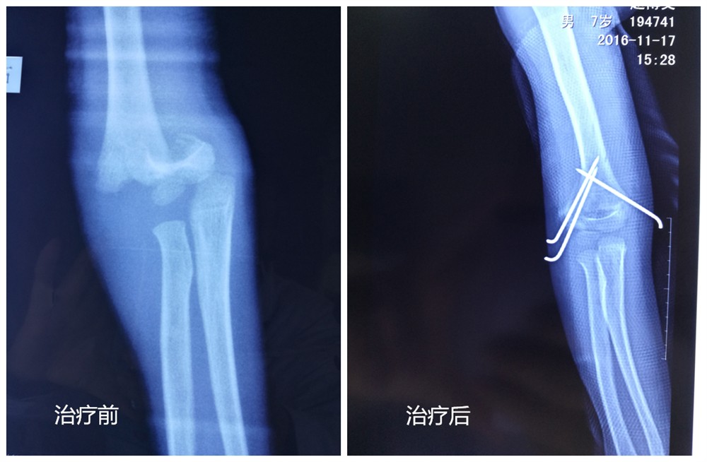 湘潭市中醫(yī)醫(yī)院二病室骨傷五科近年來派出多名醫(yī)師前往北京積水潭醫(yī)院、北大人民醫(yī)院骨科進修學習,不斷提高業(yè)務(wù)技術(shù)水平,學習國內(nèi)外先進診療理念并應用于臨床工作中,針對小兒肱骨髁上骨折患者該科室在總結(jié)過去經(jīng)驗教訓的基礎(chǔ)上摸索出了一套適合地市級醫(yī)院的診療方案,近期收治多例“不穩(wěn)定型”肱骨髁上骨折均在外院進行了反復多次的手法整復后骨折復位失敗,出血局部軟組織嚴重腫脹、張力性水泡等并發(fā)癥,來院就診時均為傷后3-5天,由于錯過了最佳治療時期采用常規(guī)手法整復、小夾板固定治療十分困難,如采用開放復位內(nèi)固定很容易導致傷口感染、骨化性肌炎、肘關(guān)節(jié)僵硬等并發(fā)癥,針對這種十分棘手的病例該科室采取了麻醉下閉合復位經(jīng)皮穿針固定的微創(chuàng)治療方案,術(shù)中使用中醫(yī)骨傷科傳統(tǒng)的“拔伸牽引、端提擠按、旋轉(zhuǎn)屈伸”等手法使骨折得到了滿意的復位,術(shù)后配合肘關(guān)節(jié)功能支具進行功能鍛煉,術(shù)后6周患者即得到了滿意的功能恢復。