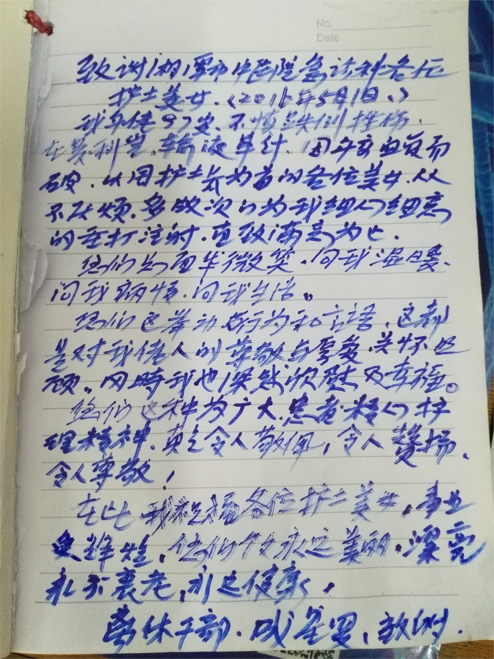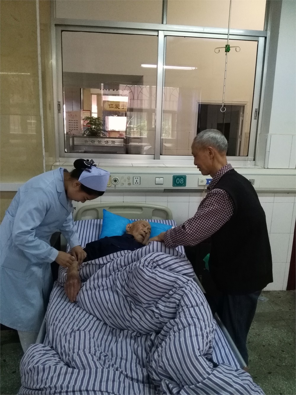 來到留觀室,“成嗲嗲,打針不舒服吧,針頭動(dòng)出來了呀?沒關(guān)系的,我們?cè)俅?,一定要把病治好?rdquo;我安慰了患者,就開始找血管準(zhǔn)備輸液。老人家97歲高齡了,身患多種疾病,早些天才從二醫(yī)院出院回家,這次因?yàn)樯舷词珠g時(shí)不慎從坐便凳跌落受傷來我科留觀輸液。長(zhǎng)期的輸液加之年事已高,老人家的血管實(shí)在不好找且容易破裂,考慮打的次數(shù)多了老人也痛苦,在征得老人和家屬同意后,決定進(jìn)行留置針輸液,同時(shí)因成老很愛動(dòng),為避免跑針,使用了約束帶。針重新打好了,為了避免老人手亂動(dòng)導(dǎo)致輸液滴數(shù)過快或過慢,我們十多分鐘就過去巡視一下,調(diào)整一下體位,再調(diào)整一下滴數(shù),不厭其煩,輸液總算順順利利進(jìn)行了。經(jīng)過兩天的治療,老人基本恢復(fù),給我們留下一封感謝信開開心心的回家休息了。