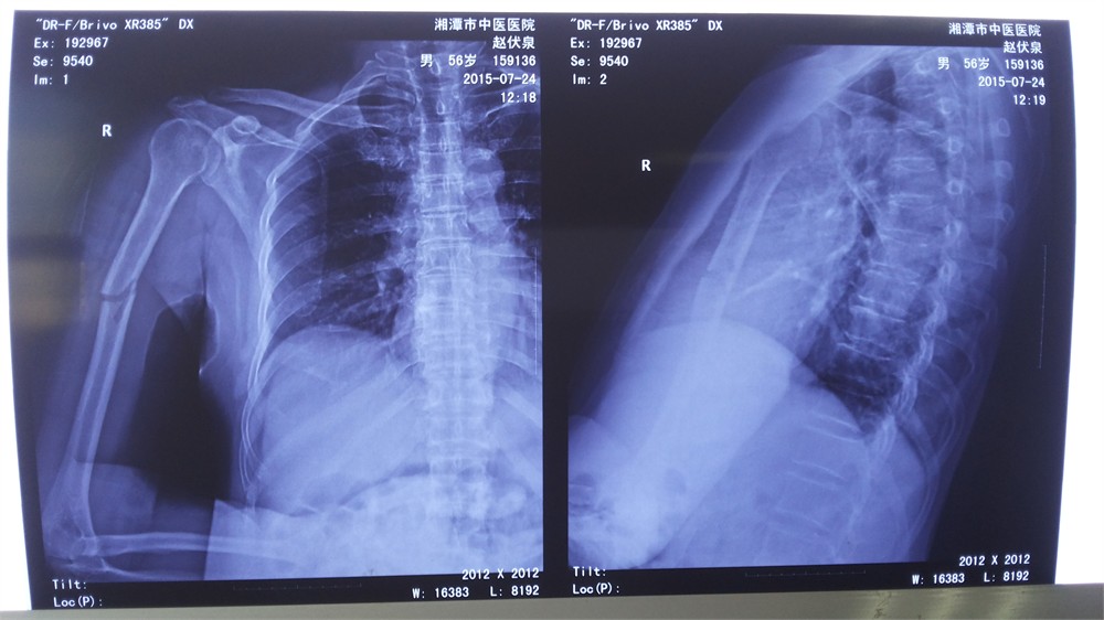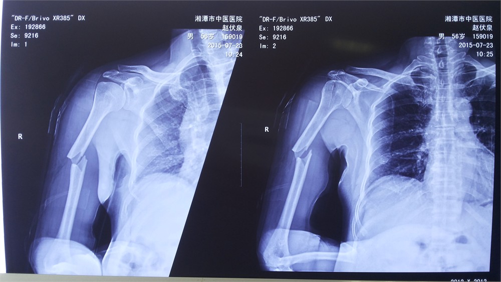 趙先生家住湘潭縣沙泉村,2015年7月底,在家摔倒致右上臂腫脹疼痛,活動(dòng)受限,來(lái)我院求治。X線片顯示:右肱骨中段骨折,斷端旋轉(zhuǎn)移位,向外后成角,骨折端有一蝶形骨片。對(duì)于這一類明顯移位并伴有旋轉(zhuǎn)的骨折,手法整復(fù)有一定的難度,而且在治療的過(guò)程中容易出現(xiàn)再次移位,現(xiàn)代醫(yī)學(xué)多主張手術(shù)治療,行切開復(fù)位鋼板內(nèi)固定。
