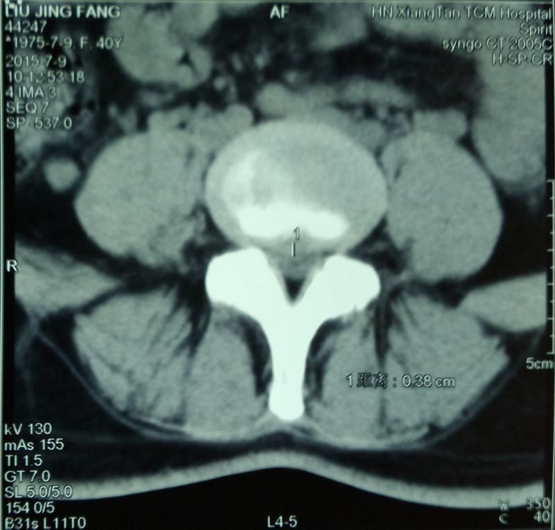 這是我院上周四仇湘中教授坐診時的一例典型門診病例,患者自訴右下肢前外側(cè)放射痛一周來診室就診,并訴5年前有左下肢后側(cè)明顯麻痛史,但經(jīng)治療后近5年一直未復(fù)發(fā)。體格檢查為:L4/5棘突間隙及右側(cè)1.5cm處壓痛,L5/S1棘突及雙側(cè)1.5cm處均無壓痛,右下肢直腿抬高試驗55°陽性,右拇趾背伸肌力稍減弱。仇教授建議患者行腰椎間盤CT檢查(見圖)提示:L5/S1椎間盤向左后方突出約0.5cm,突出物鈣化,神經(jīng)根及硬膜囊稍受壓;L4/5椎間盤中央偏右側(cè)突出約0.38cm,壓痛硬膜囊。乍一看,該患者L5/S1椎間盤突出程度明顯大于L4/5,很容易誤診為L5/S1椎間盤突出癥,但結(jié)合上述病史及體格檢查可以診斷為L4/5椎間盤突出癥,而5年前的診斷為L5/S1椎間盤突出癥。