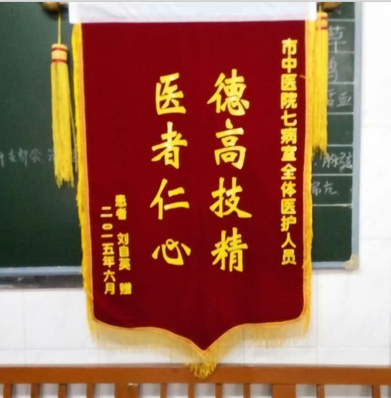 “感謝感謝,實在是太感謝了,今天特別送這么一面錦旗,以示我的感恩之心。”2015年6月11日,來自劉自英攜其家屬將一面刻有“德高技精,醫(yī)者仁心”的錦旗送到了七病室科主任及護士長手中。言語中出現(xiàn)頻率最高的詞是“感謝”二字,她握著鄧主任的手,激動的說:“我實在不知送什么,也不知說什么,只能送面錦旗以表達我對七病室醫(yī)護人員的醫(yī)術(shù)及熱情、細致、周到的服務(wù)的認可與褒揚!沒有你們,我這個老太婆可能已經(jīng)不在了”這一刻,我們的心情同樣激動不已,這個因為腦梗塞入院的奶奶,我們參與了她所有的治療過程,也看到了她一天天的變化。我們采用中西醫(yī)結(jié)合治療方法,抗凝、穩(wěn)定斑塊、營養(yǎng)神經(jīng),每日予以穴位貼敷,手指點穴,針刺以通經(jīng)活絡(luò)。短短十五天,我們見證了劉奶奶從從家屬用輪椅推送入院到她能自己走著回家的全過程。