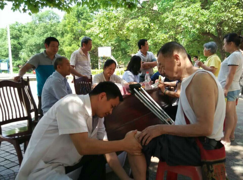 2015年6月6日上午,江濱機(jī)器廠社區(qū)林蔭小道下湘潭市中醫(yī)醫(yī)院的工作人員正有條不紊的忙著登記、量血壓、開(kāi)處方等,因?yàn)槭孪仍S多居民并不知道今天會(huì)有醫(yī)院舉行的免費(fèi)義診活動(dòng),不少老人家邊排隊(duì)候診邊打電話告知左鄰右舍前來(lái)咨詢、就診,幾位患有腎結(jié)石、腱鞘囊腫等疾病的患者圍著熊文輝主任不停的咨詢著病情,一位患有“雙下肢大隱靜脈曲張”的大爺看完病后感激的說(shuō):“我今天終于弄明白了這病為什么要手術(shù)治療了,過(guò)兩天我就去你們醫(yī)院治療”,骨傷科這邊孫飛副主任、李林峰、梁中磊主治醫(yī)師等幾個(gè)人也忙著給病人做??茩z查、解釋病情以及指導(dǎo)功能鍛煉等,膝關(guān)節(jié)骨性關(guān)節(jié)炎、腰椎間盤(pán)突出癥等患者最為常見(jiàn),一陣忙碌后翻開(kāi)登記薄,不到一上午的時(shí)間前來(lái)就診的患者就有三十幾位了……。