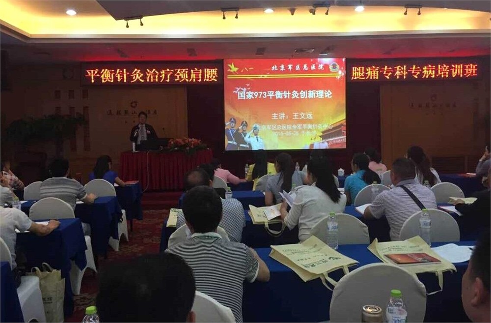 2015年5月27日至31日國家中藥管理局平衡針灸治療三高疑難病培訓(xùn)班在湖南長沙湖南長沙麓山大酒店舉行,平衡針灸創(chuàng)始人北京軍區(qū)總醫(yī)院專家組王文遠(yuǎn)教授攜弟子王曉輝、楊迪和、馬忠立副主任醫(yī)師、楊蓉博士應(yīng)邀進(jìn)行了國家973平衡針灸創(chuàng)新理論,平衡針灸創(chuàng)新技術(shù)治療頸肩腰腿痛及平衡針灸治療三高疑難病的專題講座。重點報告了國家973平衡針灸治療頸肩腰腿痛的中樞調(diào)控理論,基因修復(fù)理論和靶點、靶軸、靶位的創(chuàng)新療效機制,突出以理論創(chuàng)新為主,突出以臨床帶教為主。