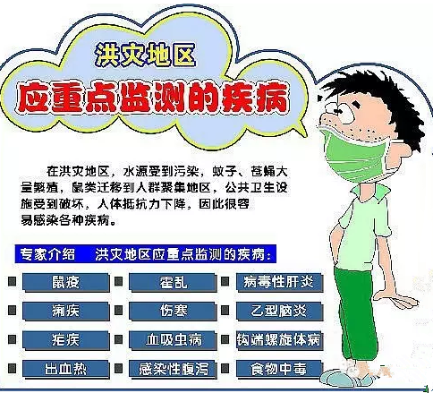 目前,因強(qiáng)降雨導(dǎo)致部分南方地區(qū)出現(xiàn)洪澇災(zāi)害。洪澇災(zāi)害極易造成疫病流行,一些多年不發(fā)生或很少發(fā)生的疫病,一些在正常年份不會發(fā)生的疾病,由于洪水的緣故,亦有可能發(fā)生。為有效預(yù)防暴雨洪澇災(zāi)害后傳染病疫情、食源性疾病等危害居民健康時間的發(fā)生及流行,保障居民身體健康,受災(zāi)群眾應(yīng)注意做到以下幾點(diǎn):
