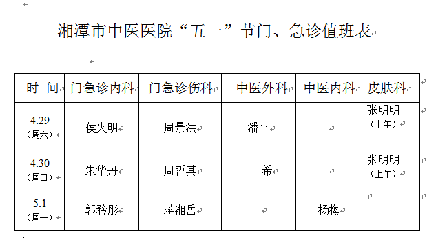 湘潭市中醫(yī)醫(yī)院“五一”節(jié)門、急診值班安排