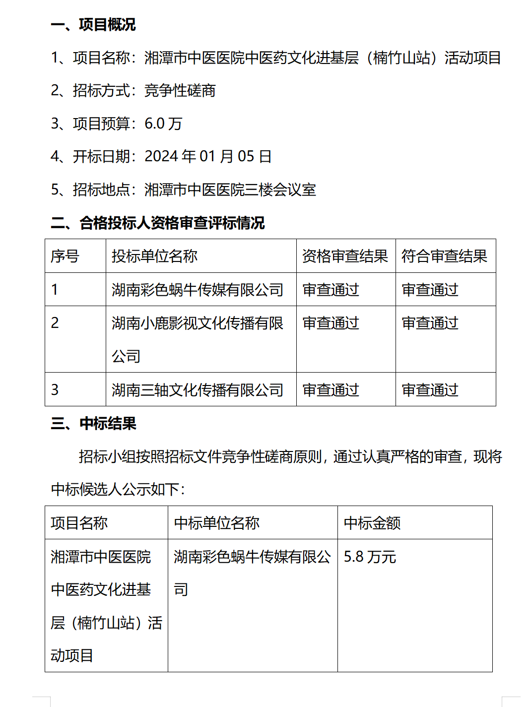 湘潭市中醫(yī)醫(yī)院中醫(yī)藥文化進(jìn)基層(楠竹山站)活動項(xiàng)目 中標(biāo)結(jié)果公示