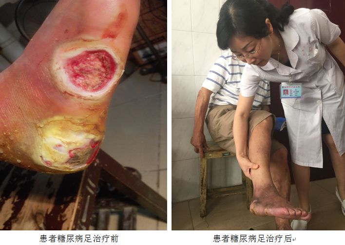 “糖尿病足是糖尿病一種嚴(yán)重的并發(fā)癥,它是由于神經(jīng)病變使下肢保護(hù)功能減退,大血管和微血管病變使動(dòng)脈灌注不足致微循環(huán)障礙而發(fā)生潰瘍和壞疽的疾病狀態(tài)。是糖尿病患者致殘,甚至致死的重要原因之一”。針對(duì)王先生這個(gè)病例,潘醫(yī)師介紹說,“對(duì)于糖尿病足的潰爛,如果單純用降糖、抗炎的方法進(jìn)行治療,傷口多半不會(huì)愈合;單純以手術(shù)清瘡,傷口也是難以生長(zhǎng)的,甚至發(fā)展到只能截肢。而我們采用自制的拔毒生肌散、六合生肌散、定痛生肌散等外敷中藥來化腐生肌、活血清毒,就能讓傷口慢慢長(zhǎng)肉直至愈合。”