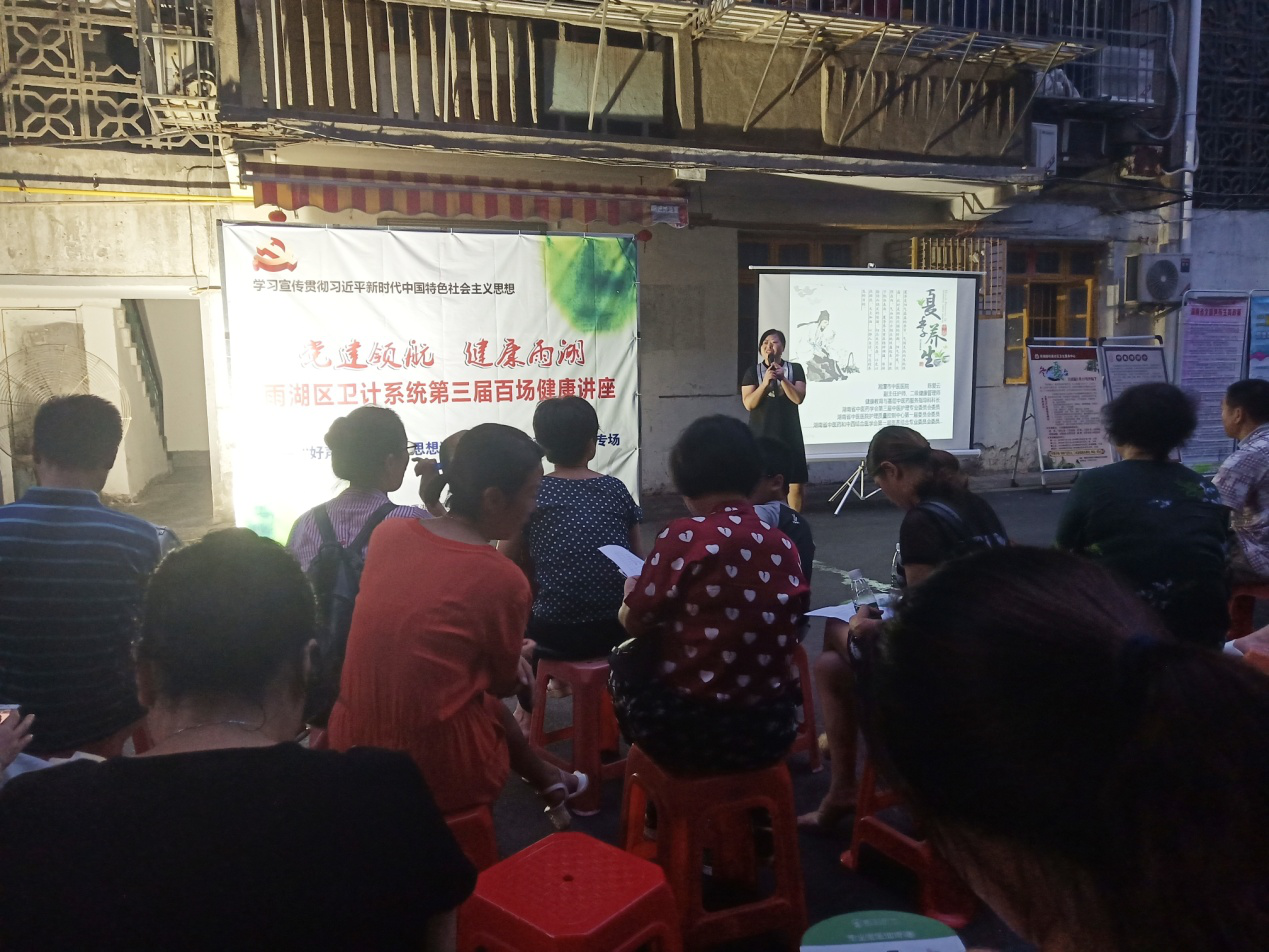 7月16日晚上,雨湖區(qū)衛(wèi)計系統(tǒng)第三屆百場健康講座開講啦!今年的主題是“黨建領航、健康雨湖”。受雨湖街道衛(wèi)生服務中心邀請,湘潭市中醫(yī)醫(yī)院健教科科長陳愛云作為百場講座開場主講嘉賓,主講“夏季中醫(yī)養(yǎng)生”。